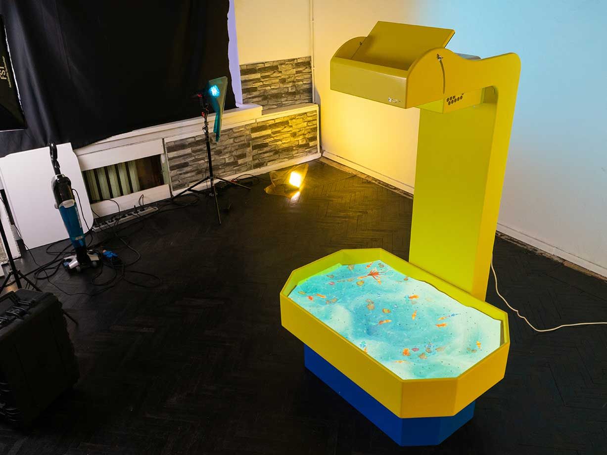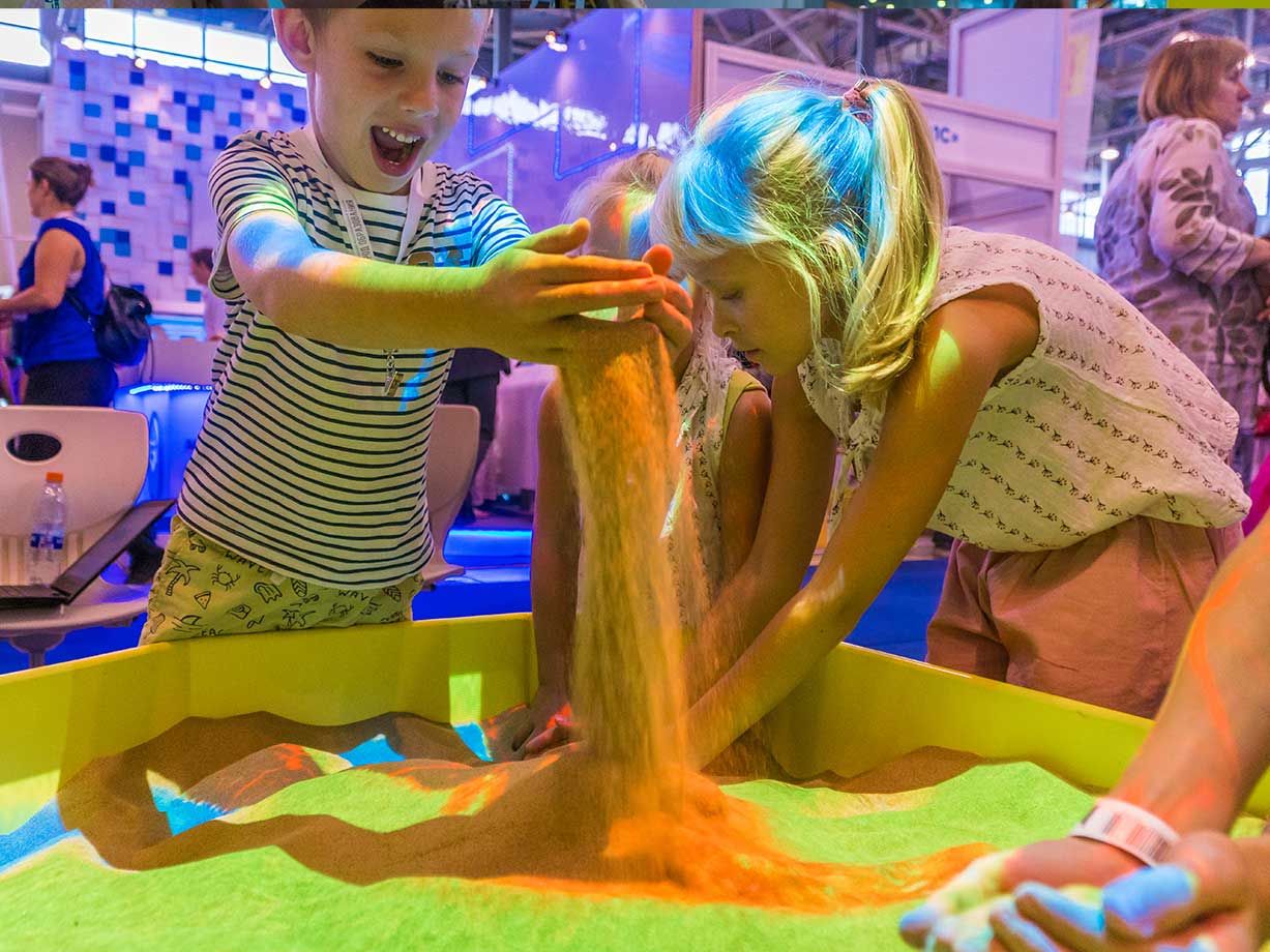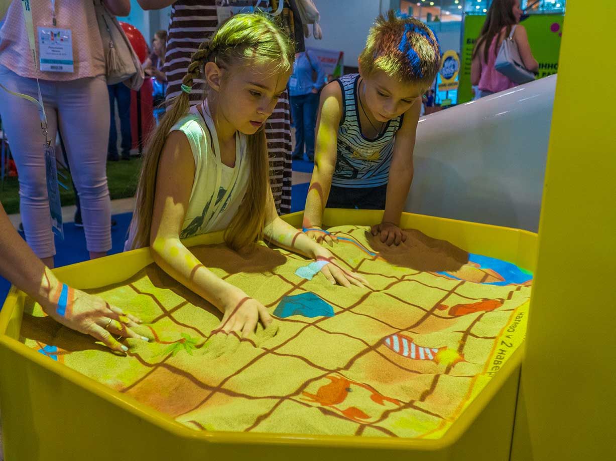 Интерактивная песочница — комплекс, в котором с помощью технологий дополненной реальности дети строят на песке свои миры с озёрами и горами, вулканами и долинами. Так дети изучают окружающий мир, географию, строение земли, цвета, фигуры, учатся ориентироваться в пространстве, развивают память, внимание и логику.
